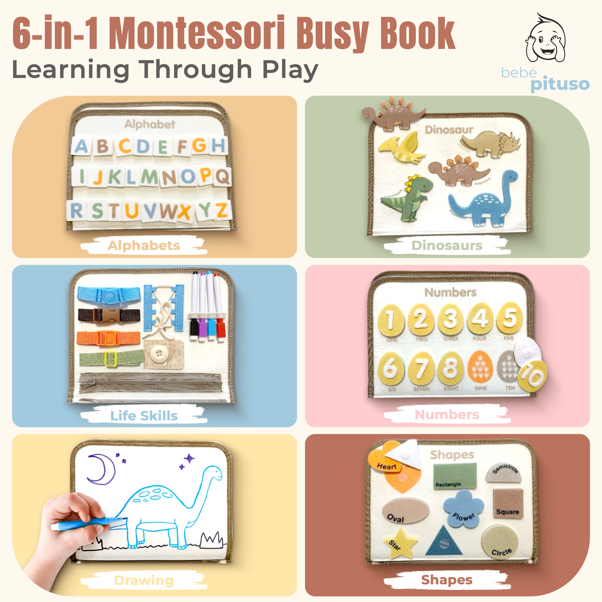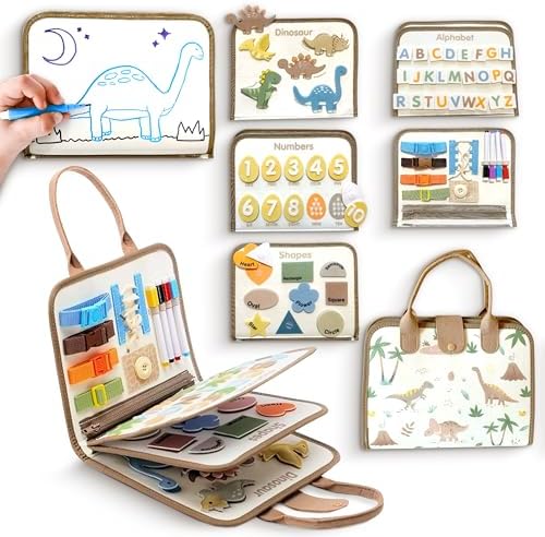 🦖 [Busy Book Montessori Dino para aprender jugando] Libro montessori 4 años con juegos de lógica, cierres y formas que estimula la motricidad fina, la concentración y el juego autónomo. Perfecto para niños de 3, 4 y 5 años que aman los dinosaurios y con pizarra infantil