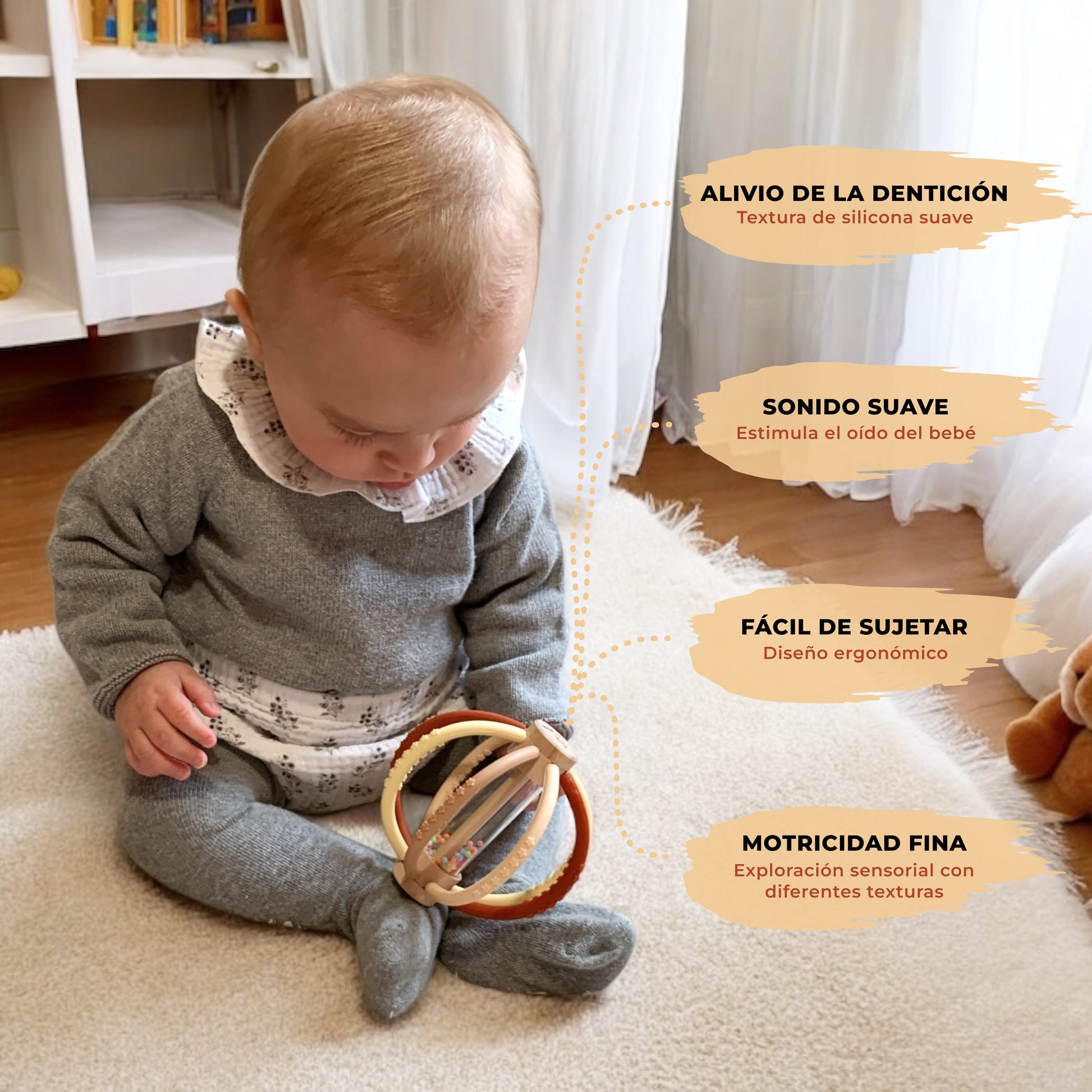 ✋ [Fácil de agarrar para manitas pequeñas] Diseño ergonómico pensado para bebés de 0 a 6 meses, permitiendo que lo sujeten y agiten con facilidad. Ideal como juguete bebé 3 meses y para tummy time bebé.