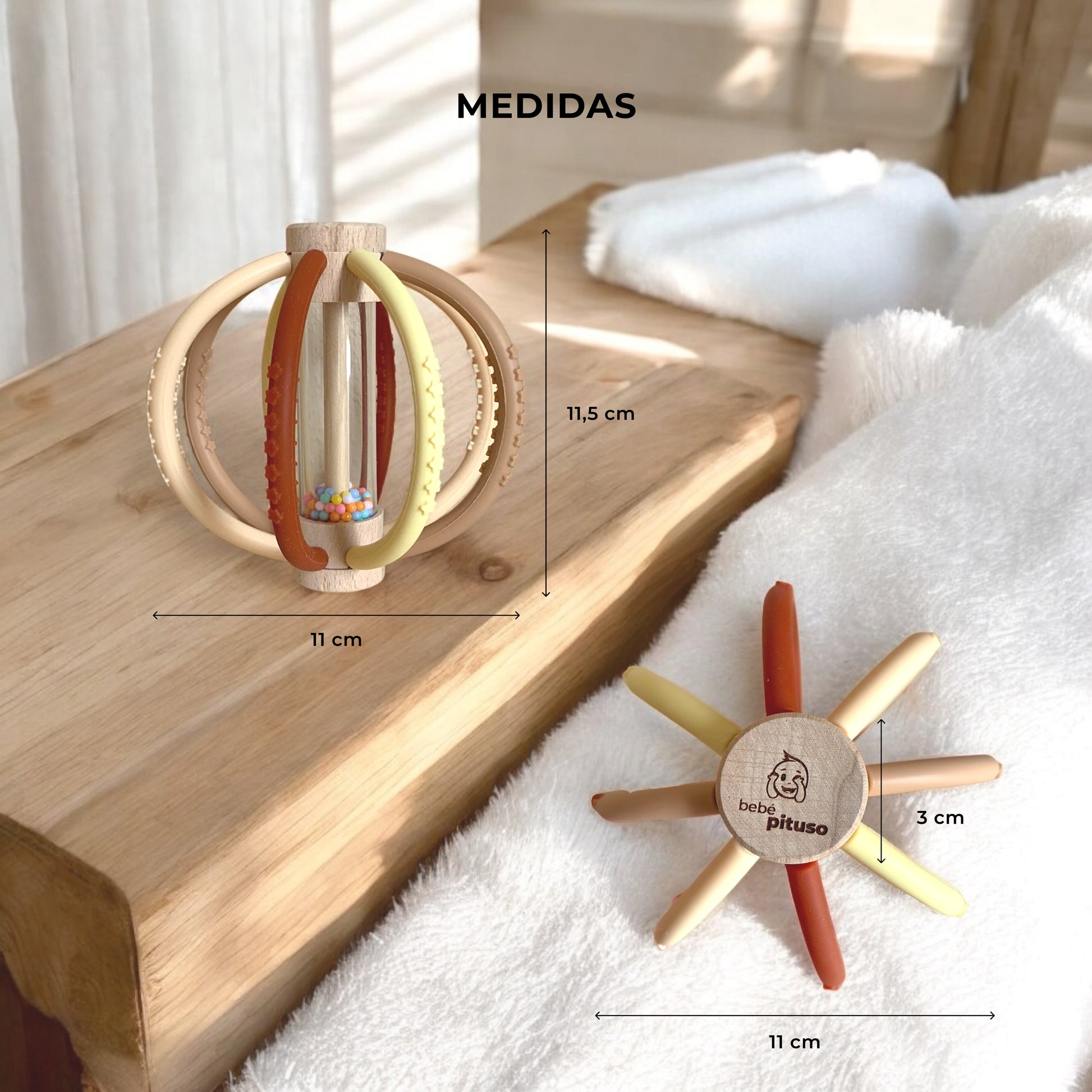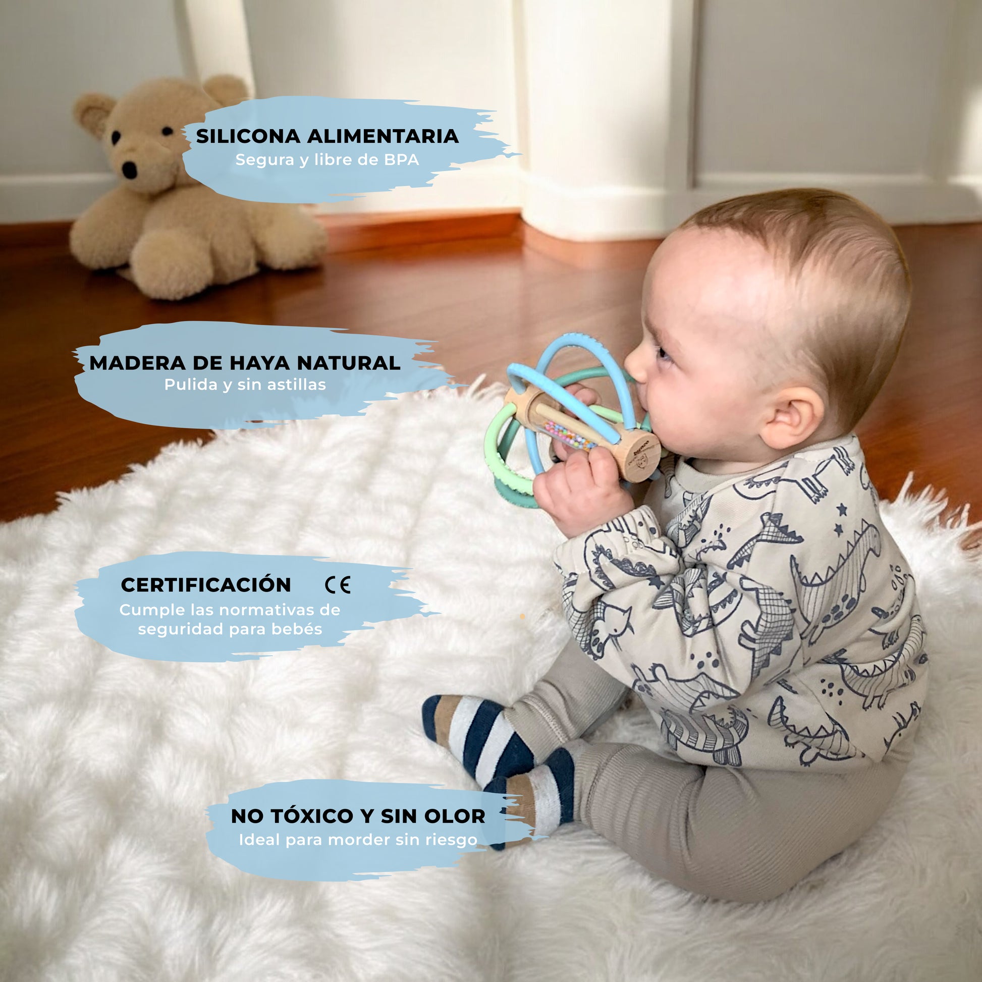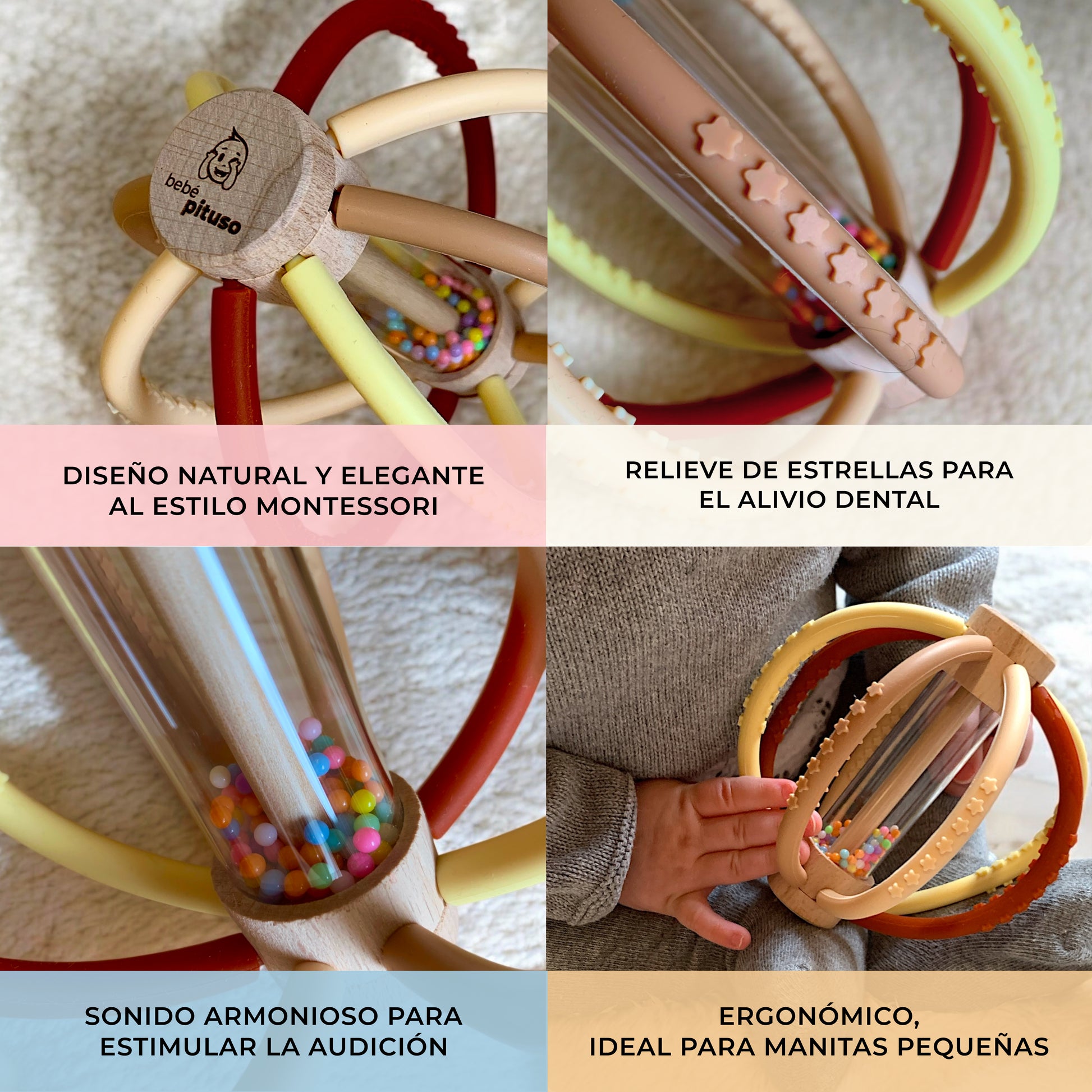 🪵 [Madera de haya y filosofía Montessori] Este sonajero y mordedor fomenta un juego sensorial respetuoso con el medio ambiente, usando materiales seguros y sostenibles para el desarrollo de tu bebé.